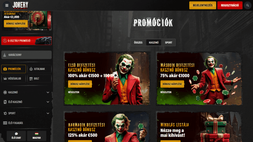 Ami elsőként feltűnt, amikor beléptem a Jokery oldalára: sportfogadáshoz itt valóban bőven van bónusz. Üdvözlő ajánlat, rendszeres promóciók, időszakos akciók – minden látványosan, a márkához illő stílusban van tálalva. Látszik, hogy a bónuszrendszer nem csak kiegészítő, hanem szerves része a játékélménynek.