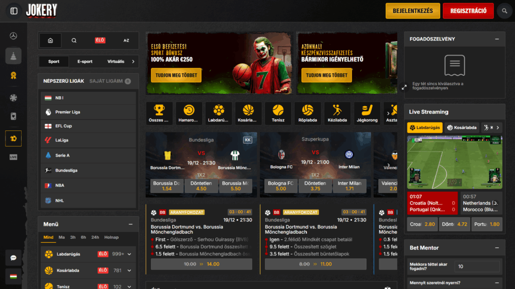 Összehasonlítottam a focira és kosárlabdára kínált piacokat más oldalakéval. A Jokery kifejezetten jól teljesít: elérhetők klasszikus piacok, mint a végeredmény, hendikep és gól/totál, de számos speciális opció is van, például játékosokra, félidőkre, kombinált fogadásokra. A live fogadás valós időben frissül, ami nálam alapelvárás.