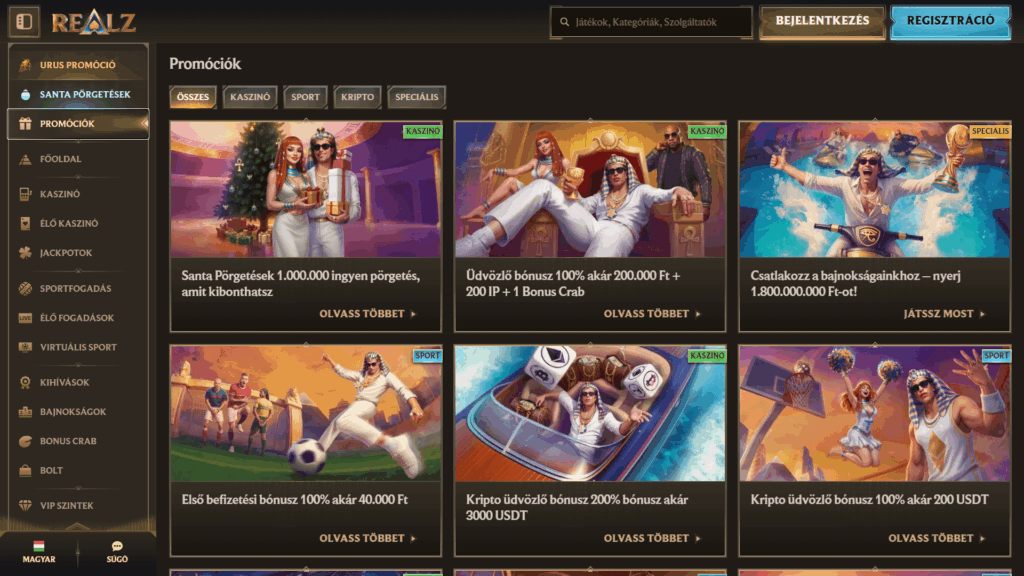 Az üdvözlő csomagon túl a Realz folyamatosan támogatja az aktív játékosokat – ezt jól mutatja a promóciók száma. Jelenleg nyolc állandó ajánlat érhető el közvetlenül a „Promóciók” oldalon. Egész jó kis kínálat ez – van itt cashback (készpénz-visszatérítés), kriptós bónusz, odds növelés és még védelem a veszteségek ellen is. Ha ismered a feltételeket, ezek tényleg jól jöhetnek. Röviden elmondom, hogyan működnek, és mire érdemes figyelni – a többi már rajtad múlik.