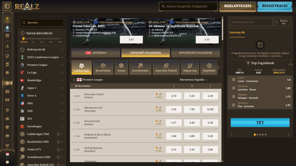 A Realzt asztali gépen és mobilon is kipróbáltam – összességében stabilan és megbízhatóan működik. Az oldal gyorsan betölt, a felület jól alkalmazkodik a kisebb képernyőkhöz, a menürendszer pedig átlátható. Könnyű eligazodni a sportfogadási piacok, a kaszinórészleg és a promóciók között.